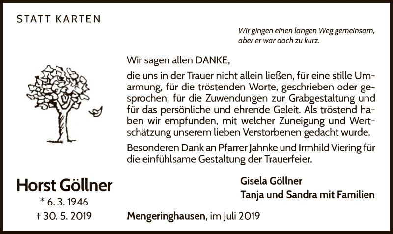 Hier finden Sie alle Traueranzeigen aus der Zeitung, die bisher für Horst Göllner erschienen sind. Weitere Traueranzeigen, die in der Zeitung erscheinen, werden hier ebenfalls aufgelistet
