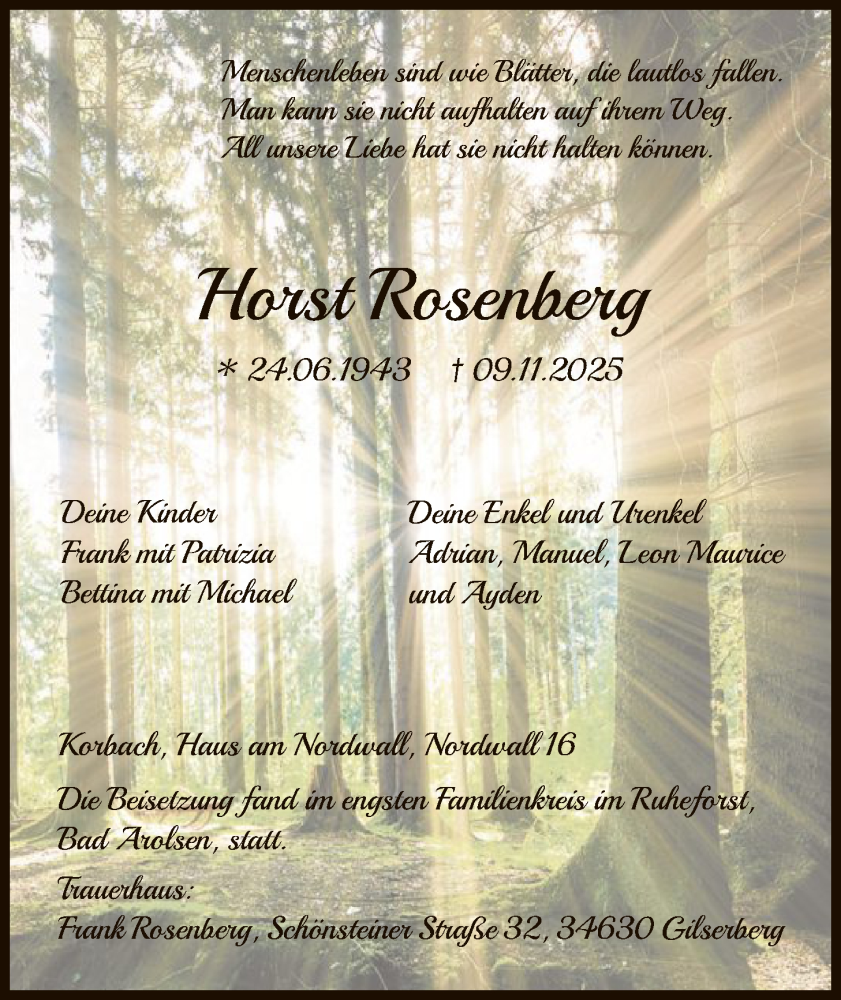 Hier finden Sie alle Traueranzeigen aus der Zeitung, die bisher für Horst Rosenberg erschienen sind. Weitere Traueranzeigen, die in der Zeitung erscheinen, werden hier ebenfalls aufgelistet