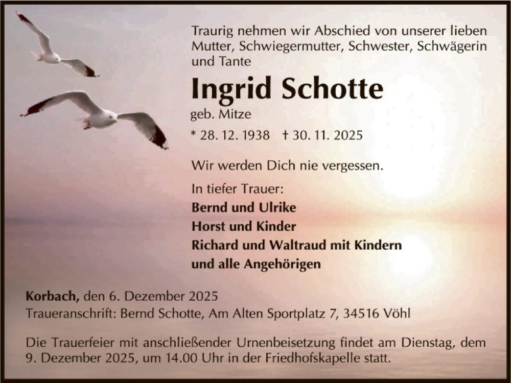 Hier finden Sie alle Traueranzeigen aus der Zeitung, die bisher für Ingrid Schotte erschienen sind. Weitere Traueranzeigen, die in der Zeitung erscheinen, werden hier ebenfalls aufgelistet