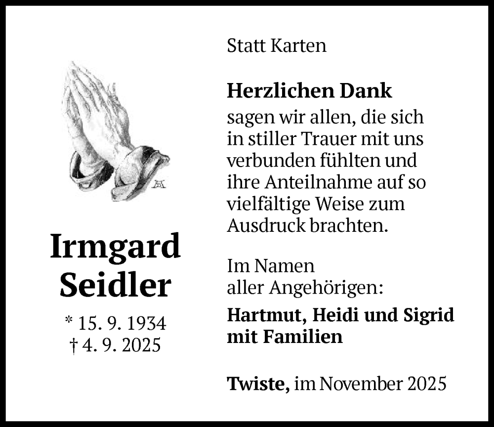 Hier finden Sie alle Traueranzeigen aus der Zeitung, die bisher für Irmgard Seidler erschienen sind. Weitere Traueranzeigen, die in der Zeitung erscheinen, werden hier ebenfalls aufgelistet