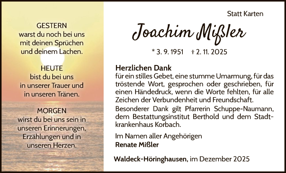 Hier finden Sie alle Traueranzeigen aus der Zeitung, die bisher für Joachim Mißler erschienen sind. Weitere Traueranzeigen, die in der Zeitung erscheinen, werden hier ebenfalls aufgelistet
