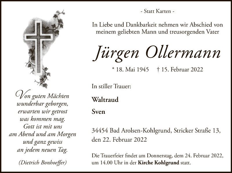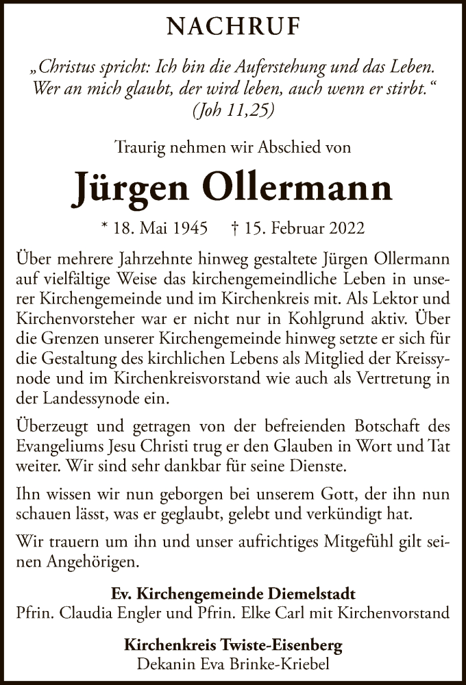 Hier finden Sie alle Traueranzeigen aus der Zeitung, die bisher für Jürgen Ollermann erschienen sind. Weitere Traueranzeigen, die in der Zeitung erscheinen, werden hier ebenfalls aufgelistet