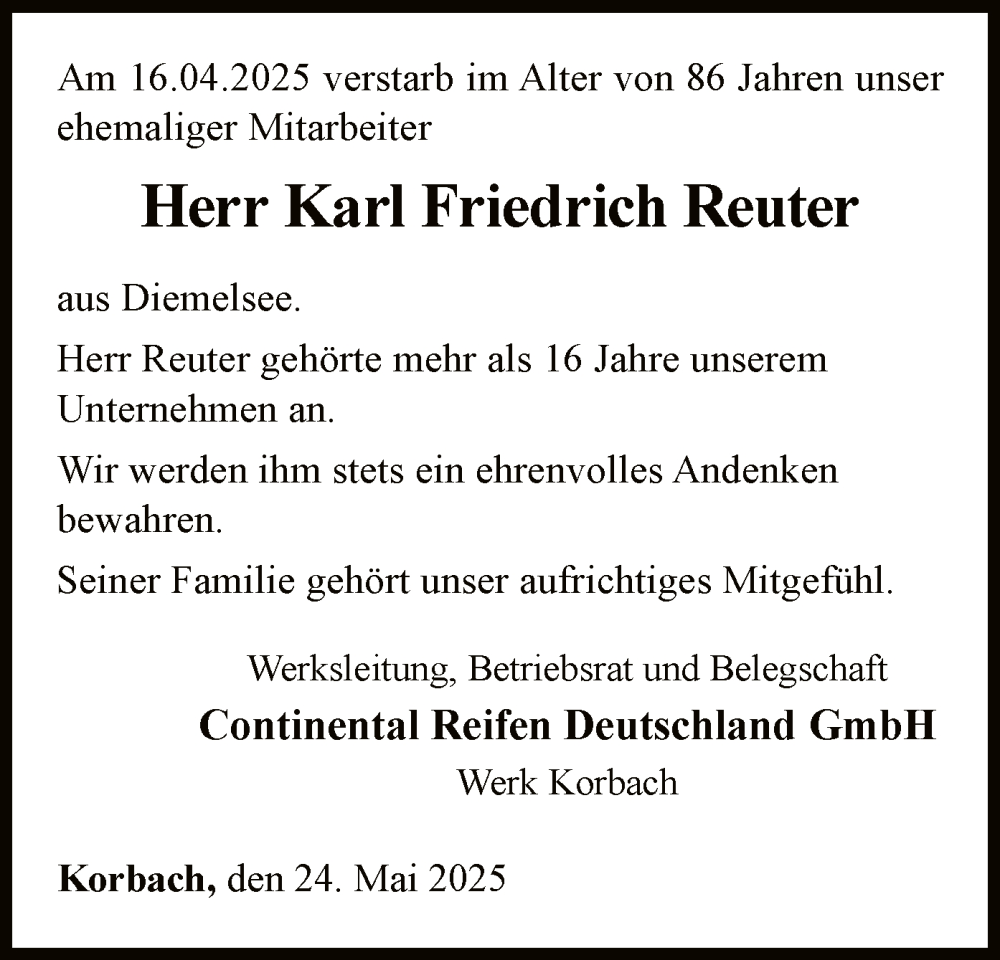 Hier finden Sie alle Traueranzeigen aus der Zeitung, die bisher für Karl Friedrich Reuter erschienen sind. Weitere Traueranzeigen, die in der Zeitung erscheinen, werden hier ebenfalls aufgelistet