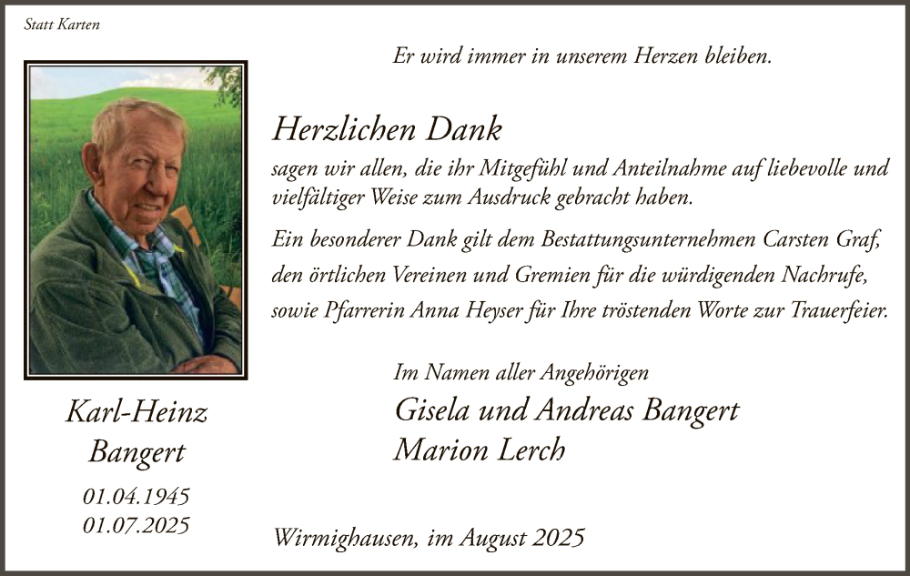 Hier finden Sie alle Traueranzeigen aus der Zeitung, die bisher für Karl-Heinz Bangert erschienen sind. Weitere Traueranzeigen, die in der Zeitung erscheinen, werden hier ebenfalls aufgelistet