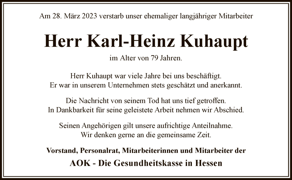 Hier finden Sie alle Traueranzeigen aus der Zeitung, die bisher für Karl-Heinz Kuhaupt erschienen sind. Weitere Traueranzeigen, die in der Zeitung erscheinen, werden hier ebenfalls aufgelistet