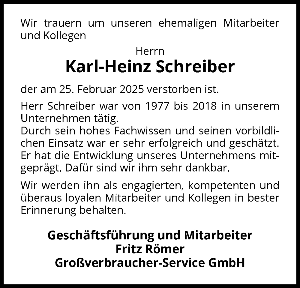 Hier finden Sie alle Traueranzeigen aus der Zeitung, die bisher für Karl-Heinz Schreiber erschienen sind. Weitere Traueranzeigen, die in der Zeitung erscheinen, werden hier ebenfalls aufgelistet
