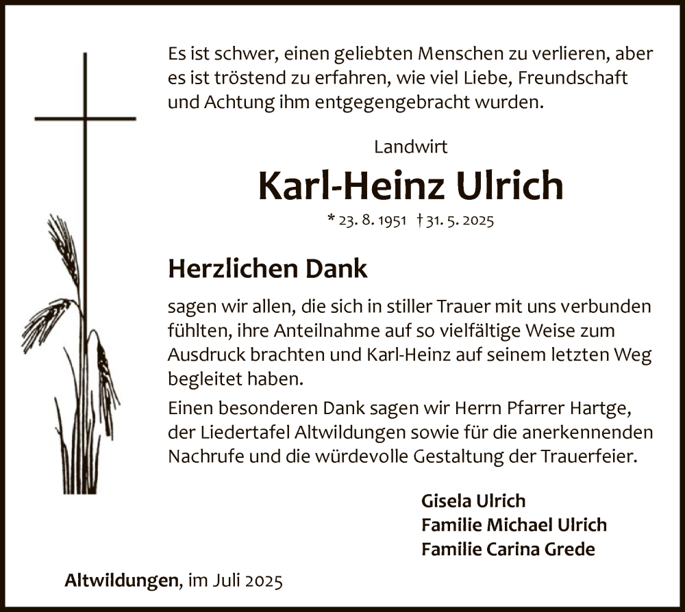 Hier finden Sie alle Traueranzeigen aus der Zeitung, die bisher für Karl-Heinz Ulrich erschienen sind. Weitere Traueranzeigen, die in der Zeitung erscheinen, werden hier ebenfalls aufgelistet