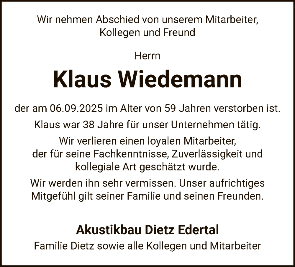 Hier finden Sie alle Traueranzeigen aus der Zeitung, die bisher für Klaus Wiedemann erschienen sind. Weitere Traueranzeigen, die in der Zeitung erscheinen, werden hier ebenfalls aufgelistet