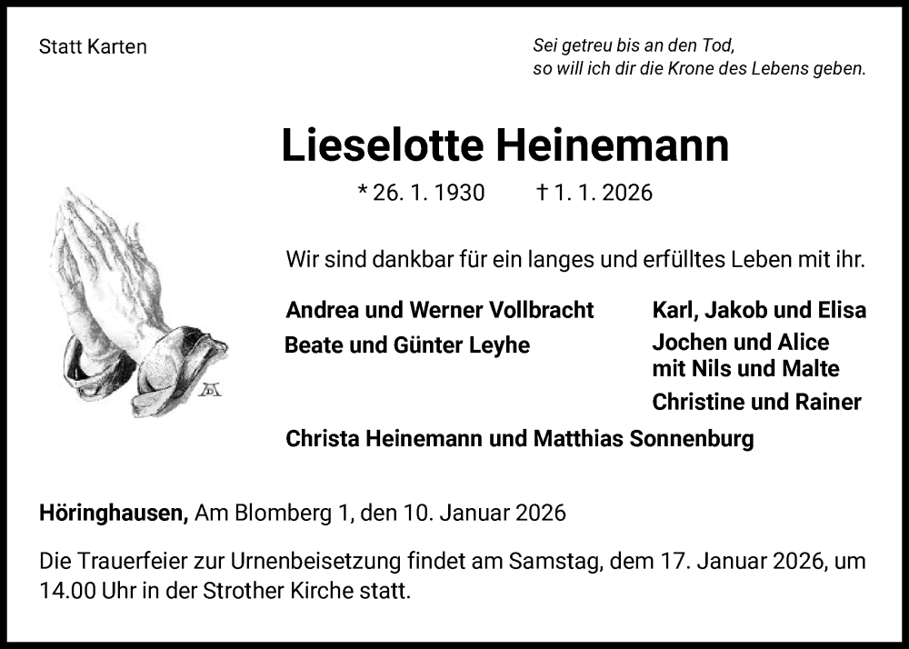 Hier finden Sie alle Traueranzeigen aus der Zeitung, die bisher für Lieselotte Heinemann erschienen sind. Weitere Traueranzeigen, die in der Zeitung erscheinen, werden hier ebenfalls aufgelistet