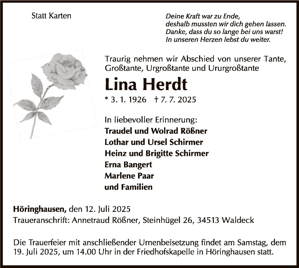 Hier finden Sie alle Traueranzeigen aus der Zeitung, die bisher für Lina Herdt erschienen sind. Weitere Traueranzeigen, die in der Zeitung erscheinen, werden hier ebenfalls aufgelistet