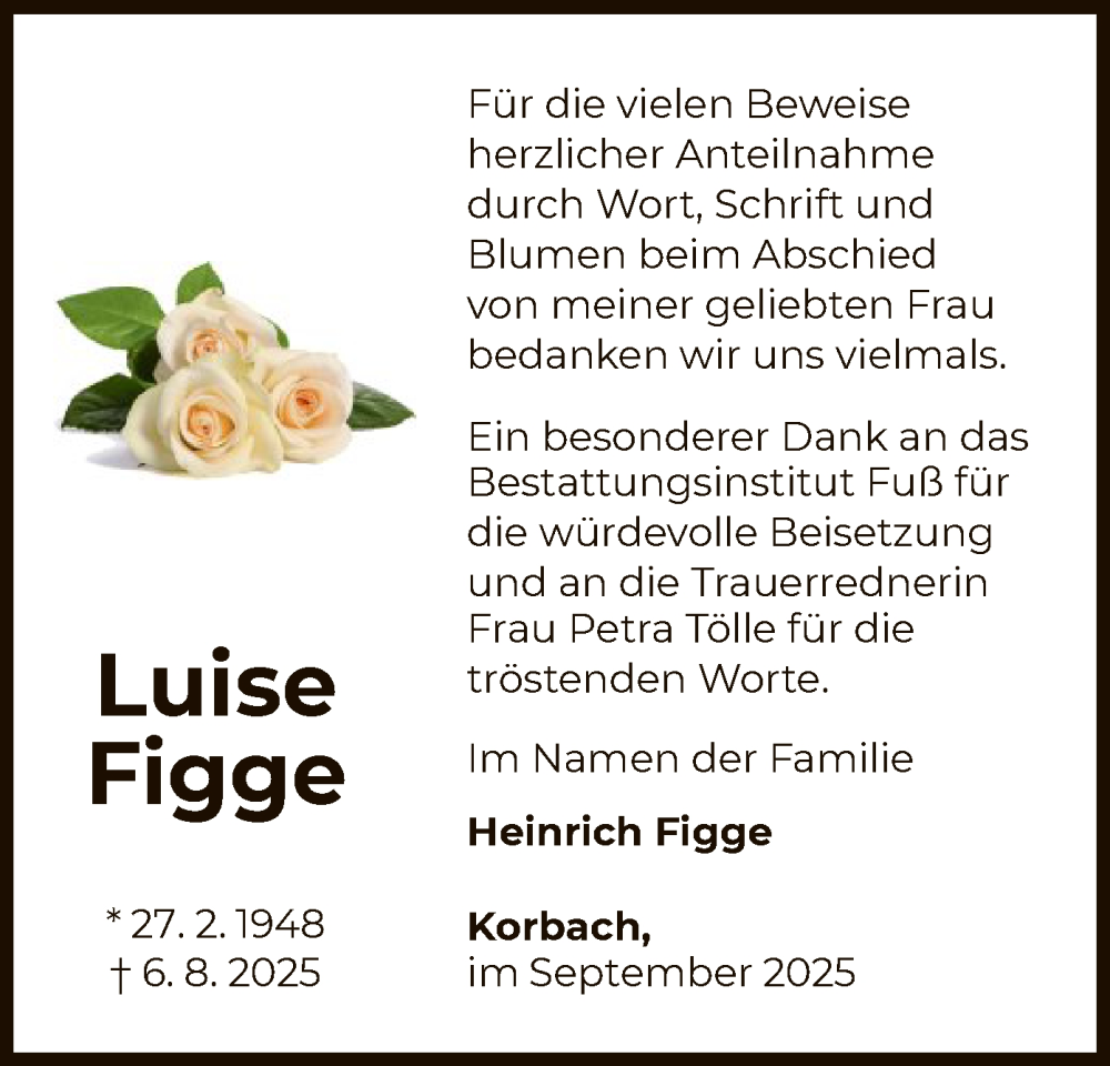 Hier finden Sie alle Traueranzeigen aus der Zeitung, die bisher für Luise Figge erschienen sind. Weitere Traueranzeigen, die in der Zeitung erscheinen, werden hier ebenfalls aufgelistet