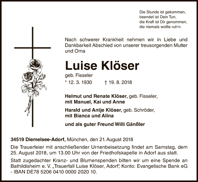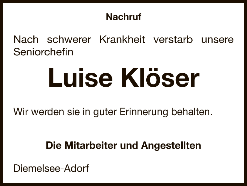 Hier finden Sie alle Traueranzeigen aus der Zeitung, die bisher für Luise Klöser erschienen sind. Weitere Traueranzeigen, die in der Zeitung erscheinen, werden hier ebenfalls aufgelistet