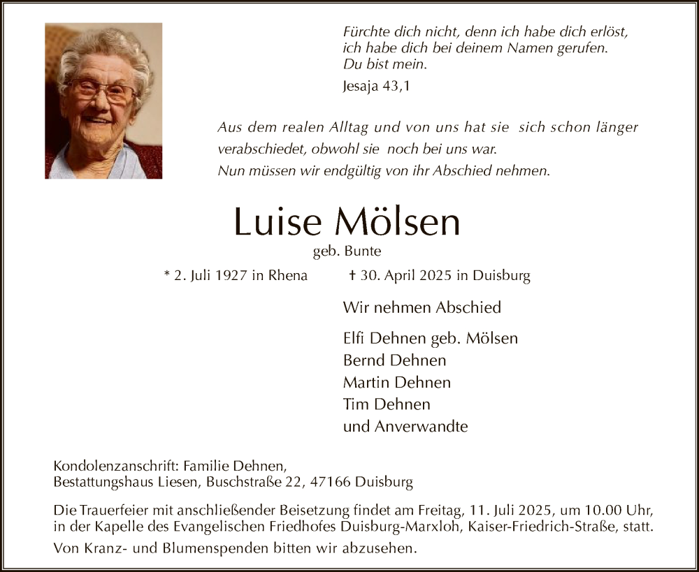 Hier finden Sie alle Traueranzeigen aus der Zeitung, die bisher für Luise Mölsen erschienen sind. Weitere Traueranzeigen, die in der Zeitung erscheinen, werden hier ebenfalls aufgelistet