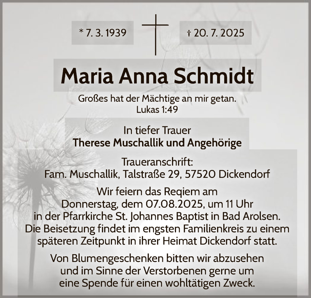 Hier finden Sie alle Traueranzeigen aus der Zeitung, die bisher für Maria Anna Schmidt erschienen sind. Weitere Traueranzeigen, die in der Zeitung erscheinen, werden hier ebenfalls aufgelistet