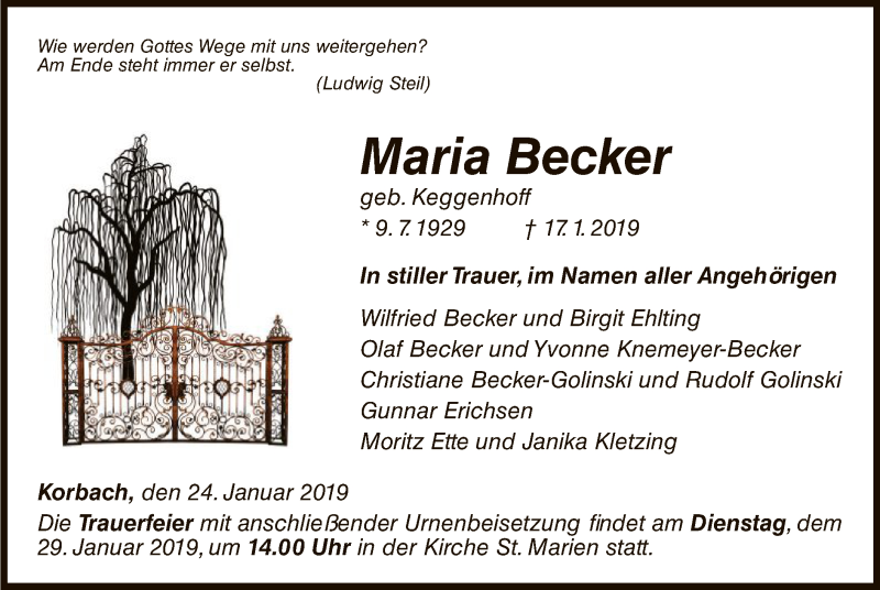 Hier finden Sie alle Traueranzeigen aus der Zeitung, die bisher für Maria Becker erschienen sind. Weitere Traueranzeigen, die in der Zeitung erscheinen, werden hier ebenfalls aufgelistet