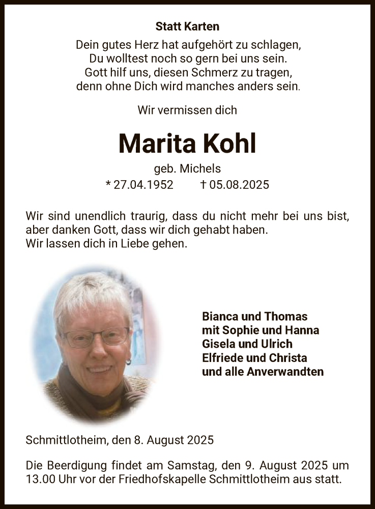 Hier finden Sie alle Traueranzeigen aus der Zeitung, die bisher für Marita Kohl erschienen sind. Weitere Traueranzeigen, die in der Zeitung erscheinen, werden hier ebenfalls aufgelistet