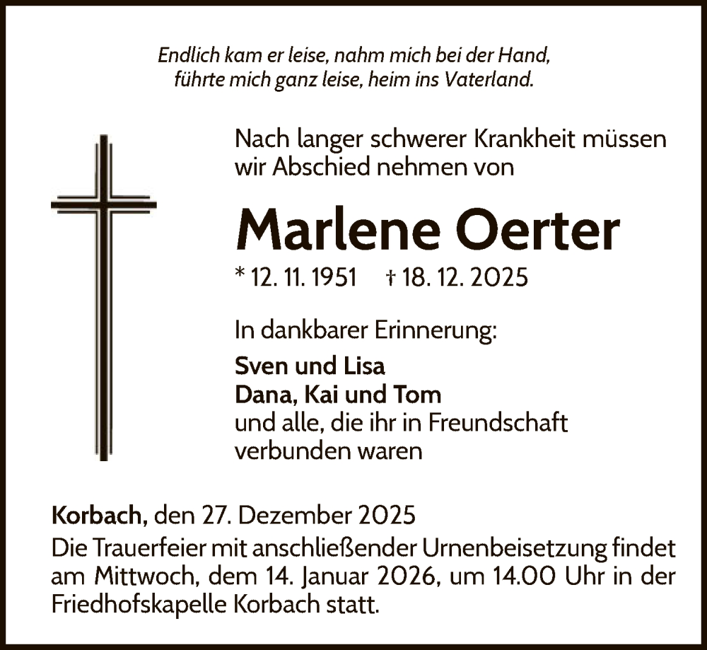 Hier finden Sie alle Traueranzeigen aus der Zeitung, die bisher für Marlene Oerter erschienen sind. Weitere Traueranzeigen, die in der Zeitung erscheinen, werden hier ebenfalls aufgelistet