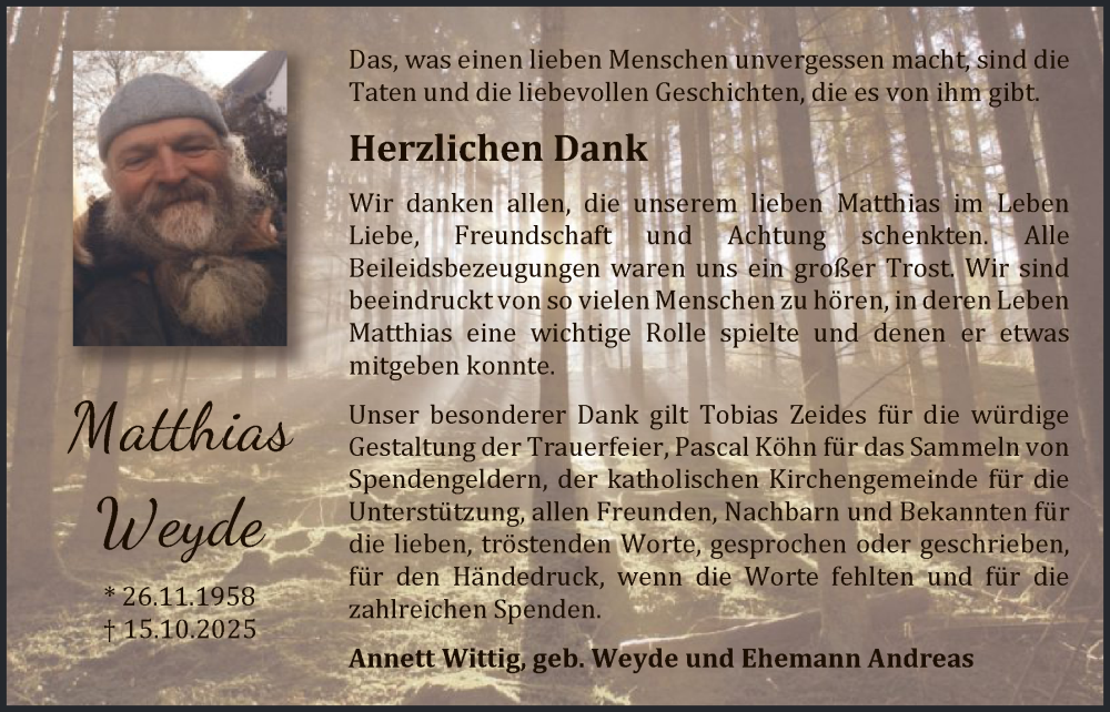 Hier finden Sie alle Traueranzeigen aus der Zeitung, die bisher für Matthias Weyde erschienen sind. Weitere Traueranzeigen, die in der Zeitung erscheinen, werden hier ebenfalls aufgelistet