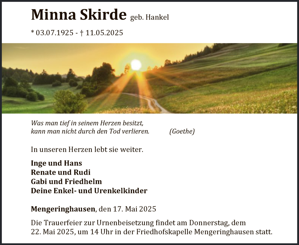 Hier finden Sie alle Traueranzeigen aus der Zeitung, die bisher für Minna Skirde erschienen sind. Weitere Traueranzeigen, die in der Zeitung erscheinen, werden hier ebenfalls aufgelistet