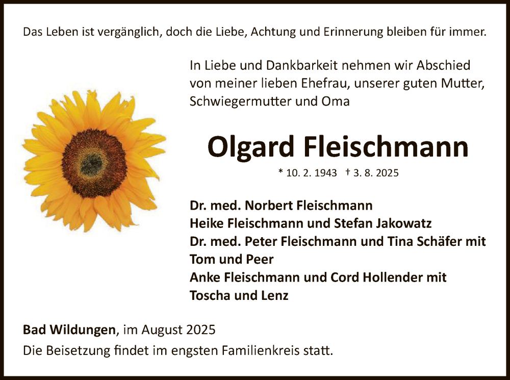 Hier finden Sie alle Traueranzeigen aus der Zeitung, die bisher für Olgard Fleischmann erschienen sind. Weitere Traueranzeigen, die in der Zeitung erscheinen, werden hier ebenfalls aufgelistet