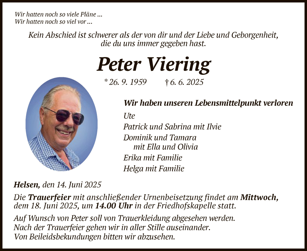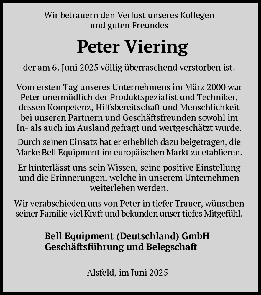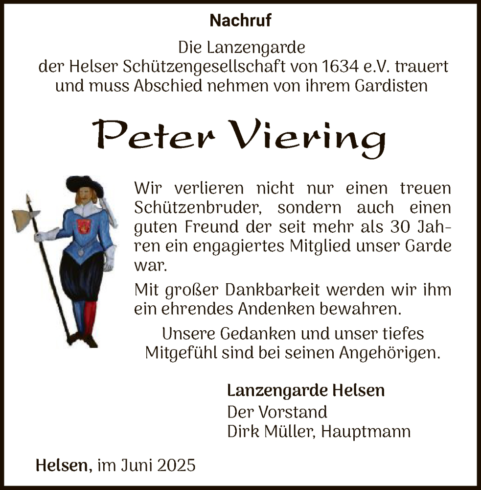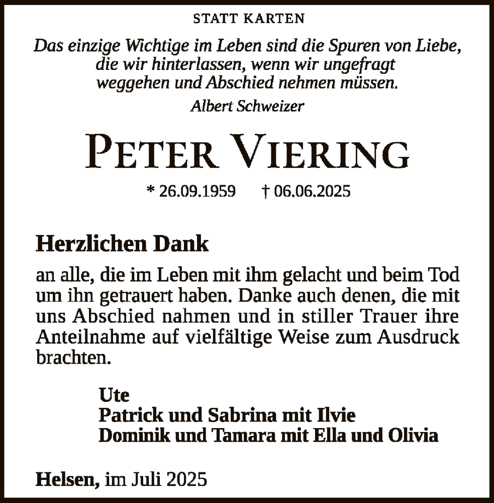 Hier finden Sie alle Traueranzeigen aus der Zeitung, die bisher für Peter Viering erschienen sind. Weitere Traueranzeigen, die in der Zeitung erscheinen, werden hier ebenfalls aufgelistet