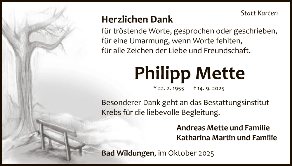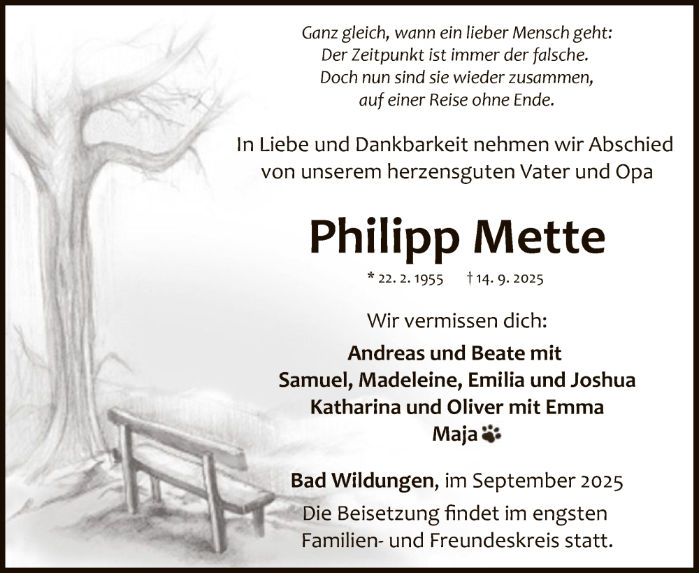 Hier finden Sie alle Traueranzeigen aus der Zeitung, die bisher für Philipp Mette erschienen sind. Weitere Traueranzeigen, die in der Zeitung erscheinen, werden hier ebenfalls aufgelistet