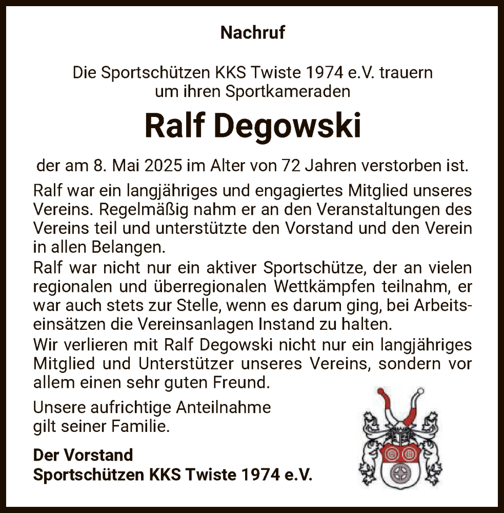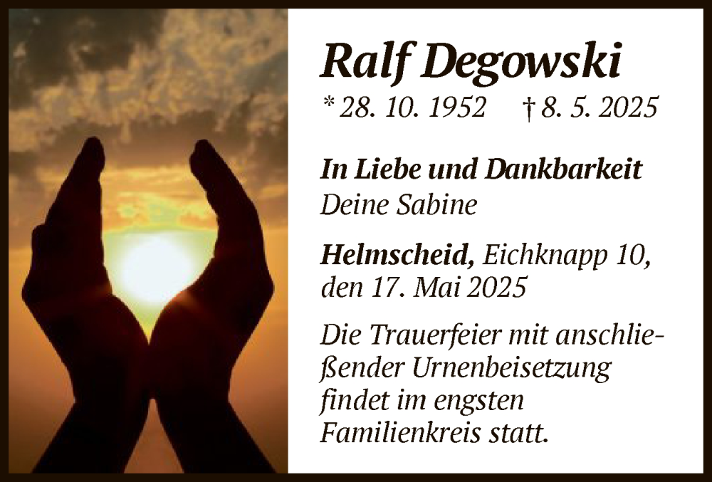 Hier finden Sie alle Traueranzeigen aus der Zeitung, die bisher für Ralf Degowski erschienen sind. Weitere Traueranzeigen, die in der Zeitung erscheinen, werden hier ebenfalls aufgelistet