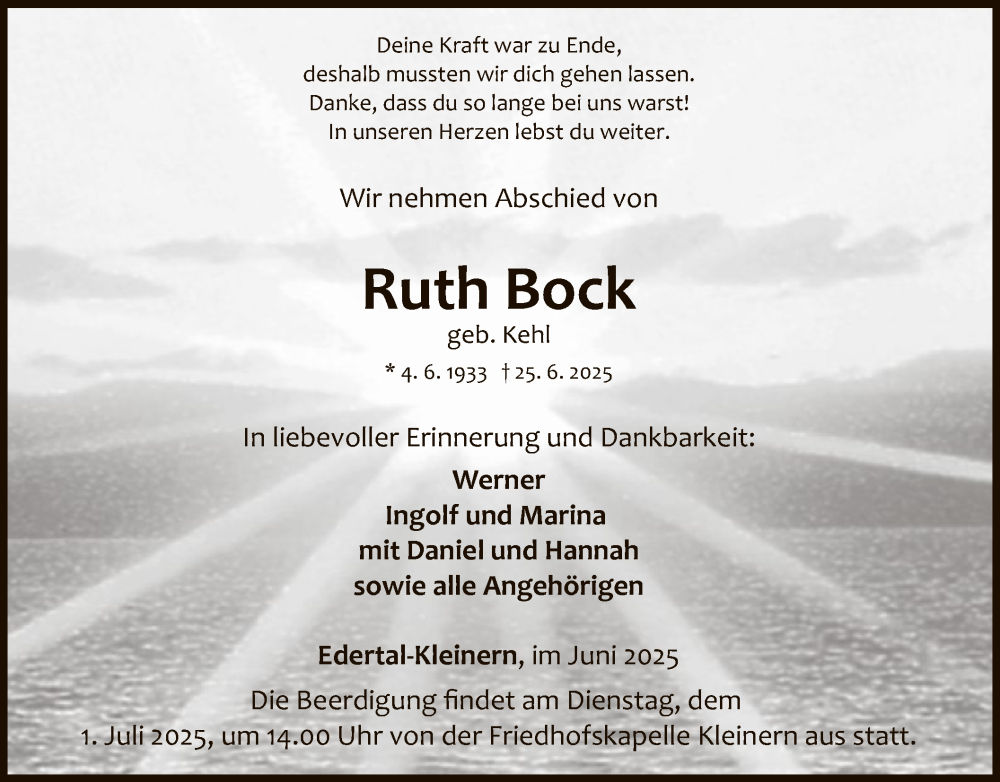 Hier finden Sie alle Traueranzeigen aus der Zeitung, die bisher für Ruth Bock erschienen sind. Weitere Traueranzeigen, die in der Zeitung erscheinen, werden hier ebenfalls aufgelistet