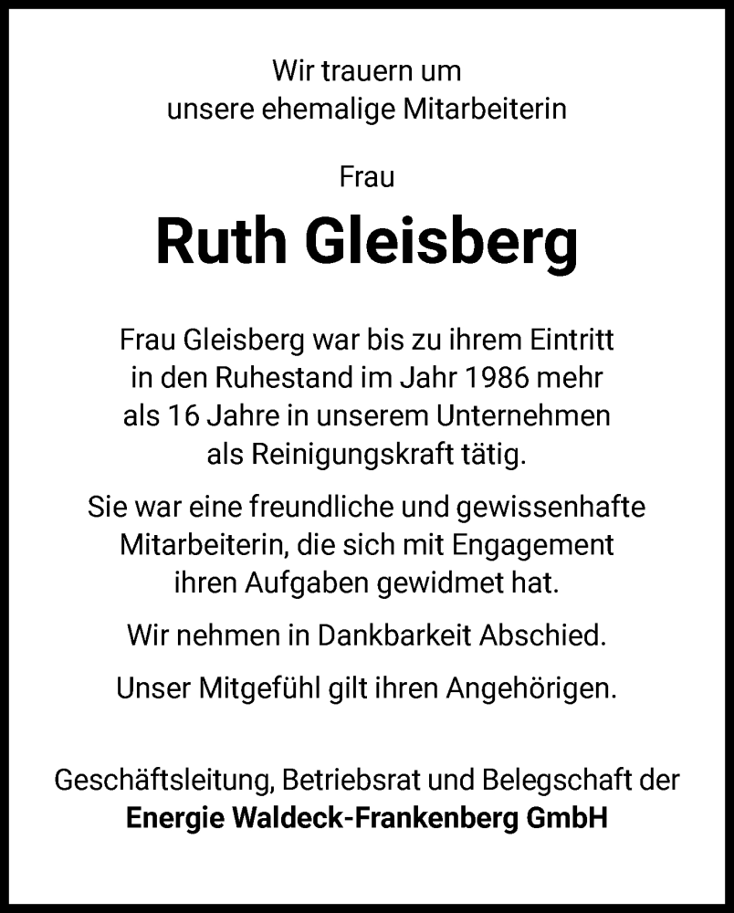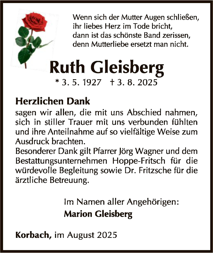 Hier finden Sie alle Traueranzeigen aus der Zeitung, die bisher für Ruth Gleisberg erschienen sind. Weitere Traueranzeigen, die in der Zeitung erscheinen, werden hier ebenfalls aufgelistet