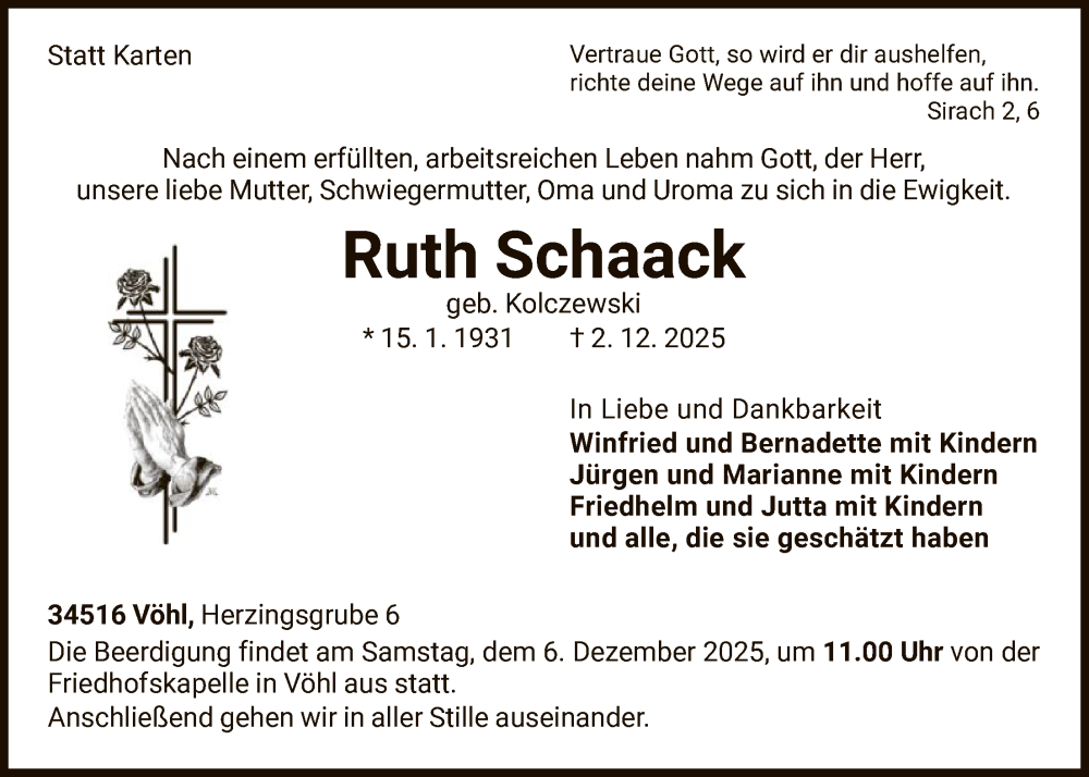 Hier finden Sie alle Traueranzeigen aus der Zeitung, die bisher für Ruth Schaack erschienen sind. Weitere Traueranzeigen, die in der Zeitung erscheinen, werden hier ebenfalls aufgelistet