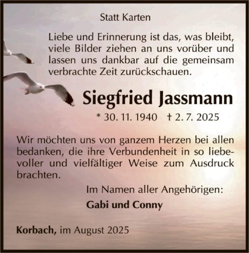 Hier finden Sie alle Traueranzeigen aus der Zeitung, die bisher für Siegfried Jassmann erschienen sind. Weitere Traueranzeigen, die in der Zeitung erscheinen, werden hier ebenfalls aufgelistet