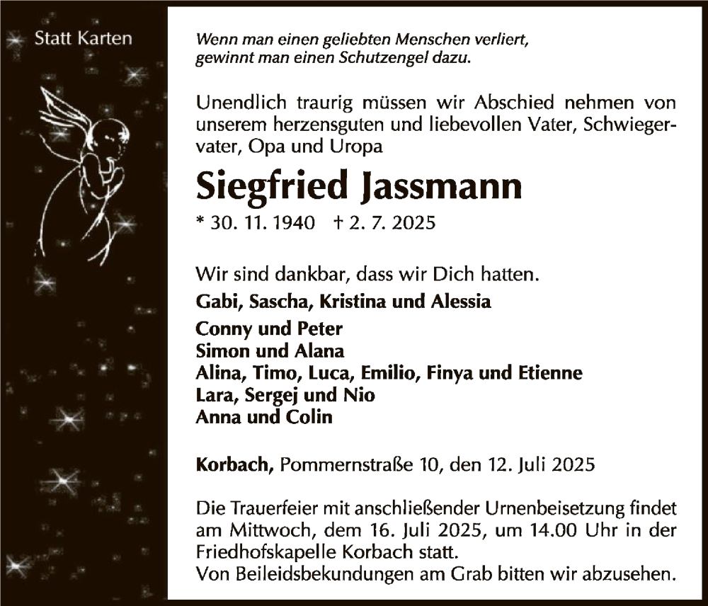 Hier finden Sie alle Traueranzeigen aus der Zeitung, die bisher für Siegfried Jassmann erschienen sind. Weitere Traueranzeigen, die in der Zeitung erscheinen, werden hier ebenfalls aufgelistet
