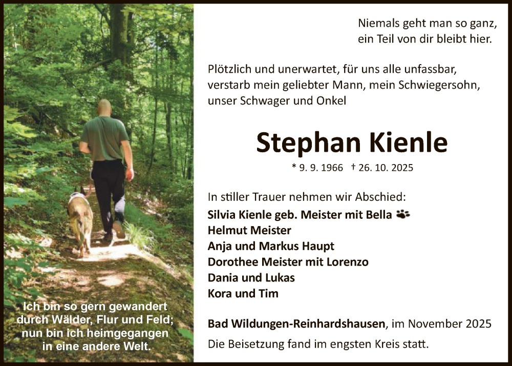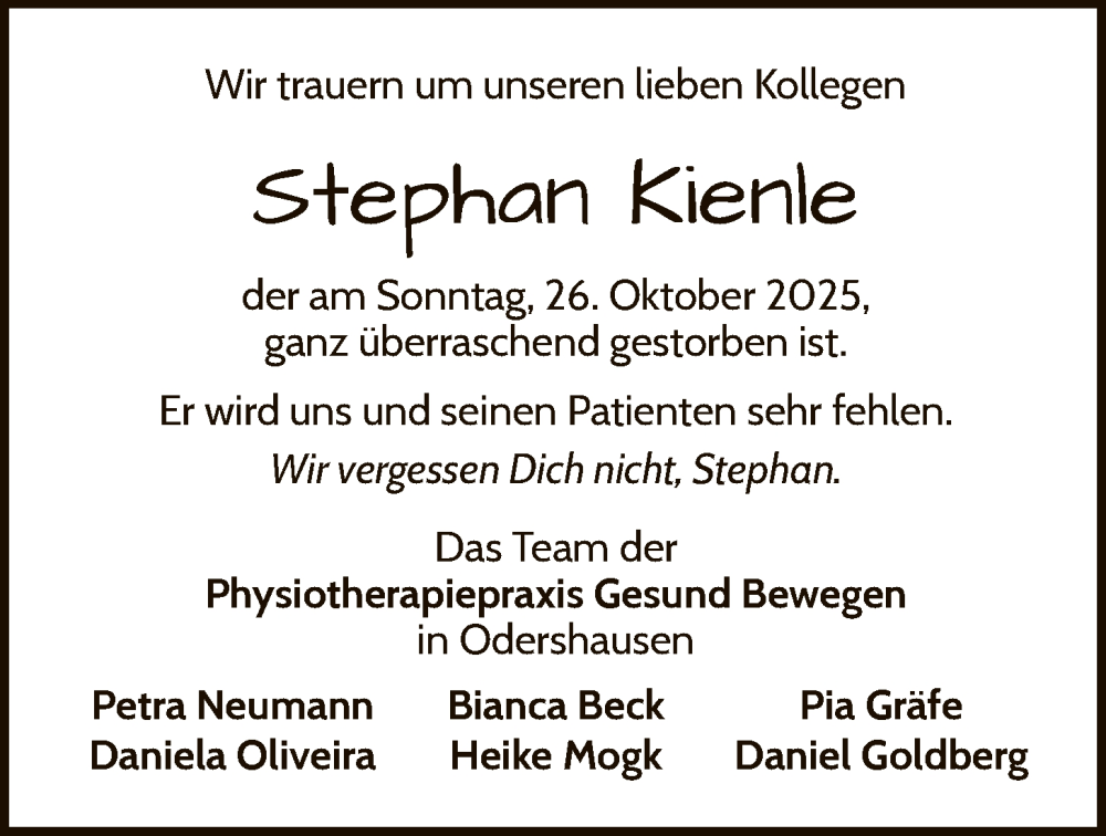 Hier finden Sie alle Traueranzeigen aus der Zeitung, die bisher für Stephan Kienle erschienen sind. Weitere Traueranzeigen, die in der Zeitung erscheinen, werden hier ebenfalls aufgelistet