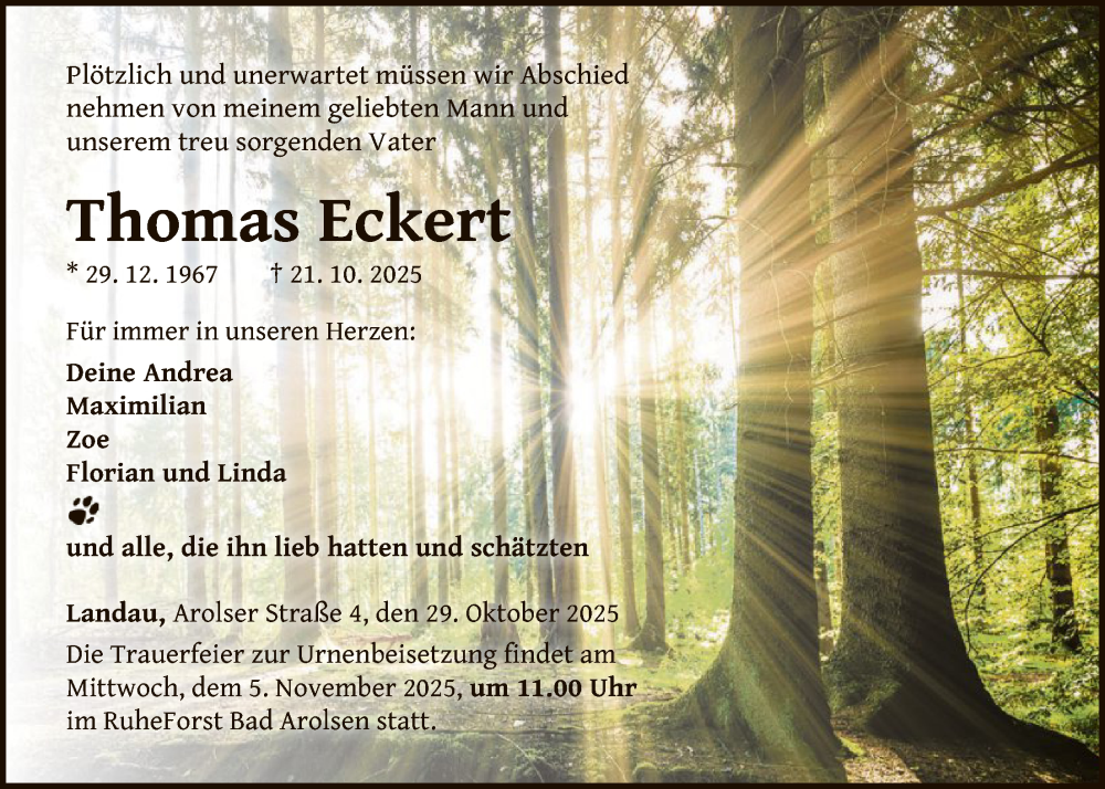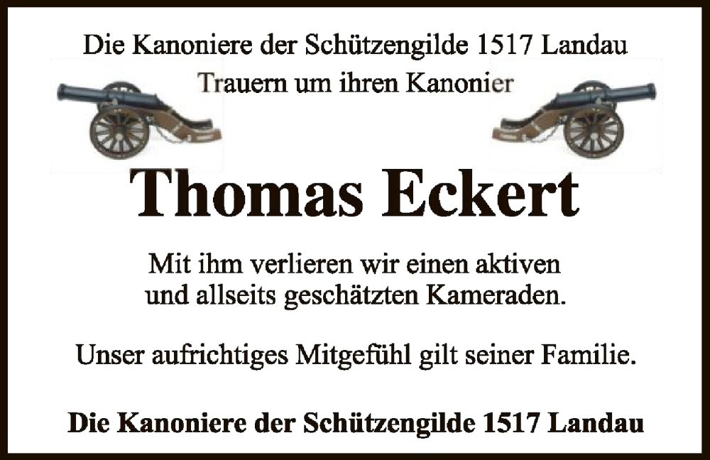 Hier finden Sie alle Traueranzeigen aus der Zeitung, die bisher für Thomas Eckert erschienen sind. Weitere Traueranzeigen, die in der Zeitung erscheinen, werden hier ebenfalls aufgelistet