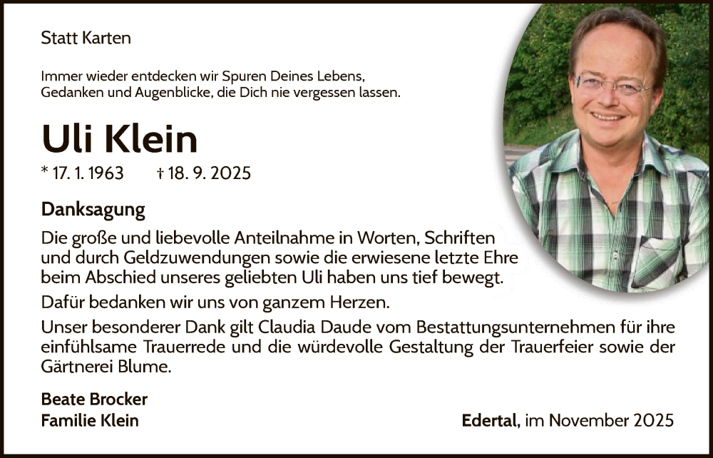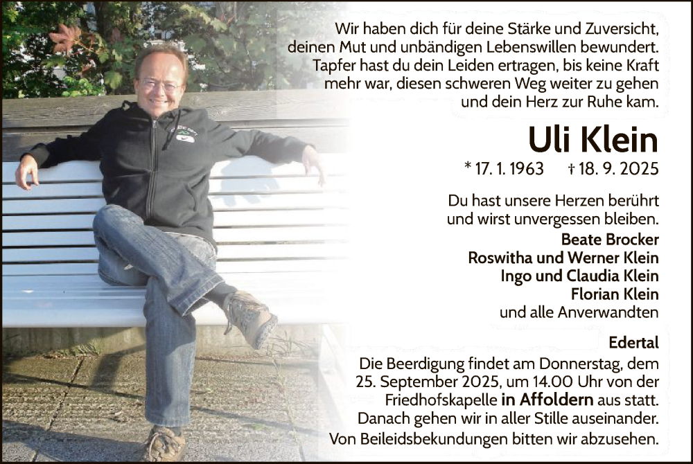Hier finden Sie alle Traueranzeigen aus der Zeitung, die bisher für Uli Klein erschienen sind. Weitere Traueranzeigen, die in der Zeitung erscheinen, werden hier ebenfalls aufgelistet