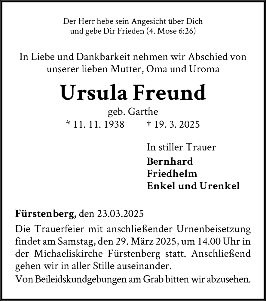 Hier finden Sie alle Traueranzeigen aus der Zeitung, die bisher für Ursula Freund erschienen sind. Weitere Traueranzeigen, die in der Zeitung erscheinen, werden hier ebenfalls aufgelistet