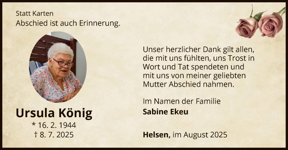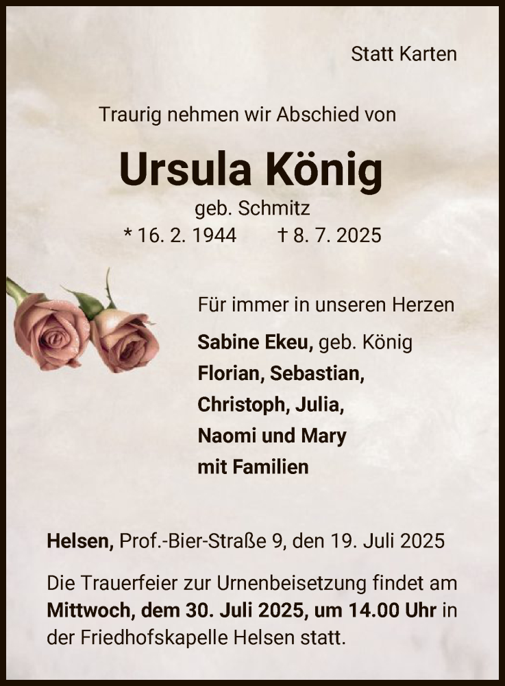 Hier finden Sie alle Traueranzeigen aus der Zeitung, die bisher für Ursula König erschienen sind. Weitere Traueranzeigen, die in der Zeitung erscheinen, werden hier ebenfalls aufgelistet