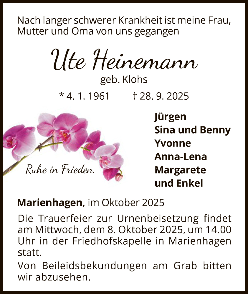 Hier finden Sie alle Traueranzeigen aus der Zeitung, die bisher für Ute Heinemann erschienen sind. Weitere Traueranzeigen, die in der Zeitung erscheinen, werden hier ebenfalls aufgelistet