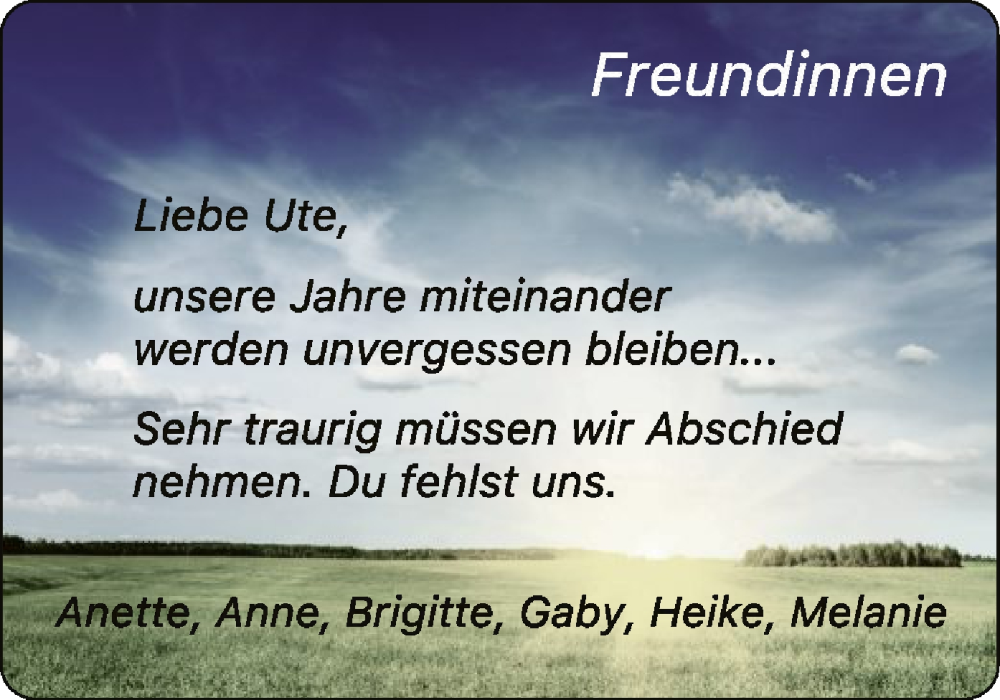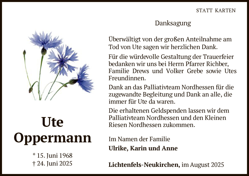 Hier finden Sie alle Traueranzeigen aus der Zeitung, die bisher für Ute Oppermann erschienen sind. Weitere Traueranzeigen, die in der Zeitung erscheinen, werden hier ebenfalls aufgelistet