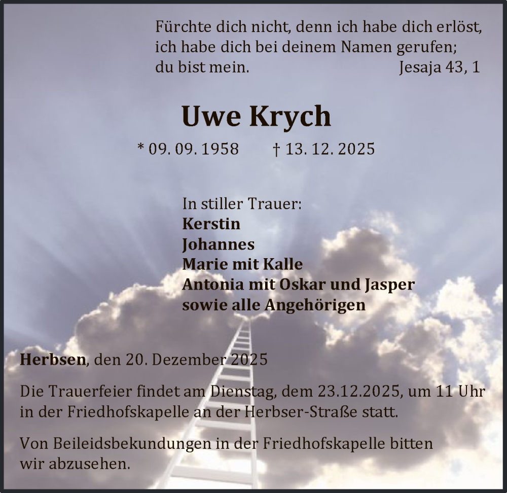 Hier finden Sie alle Traueranzeigen aus der Zeitung, die bisher für Uwe Krych erschienen sind. Weitere Traueranzeigen, die in der Zeitung erscheinen, werden hier ebenfalls aufgelistet