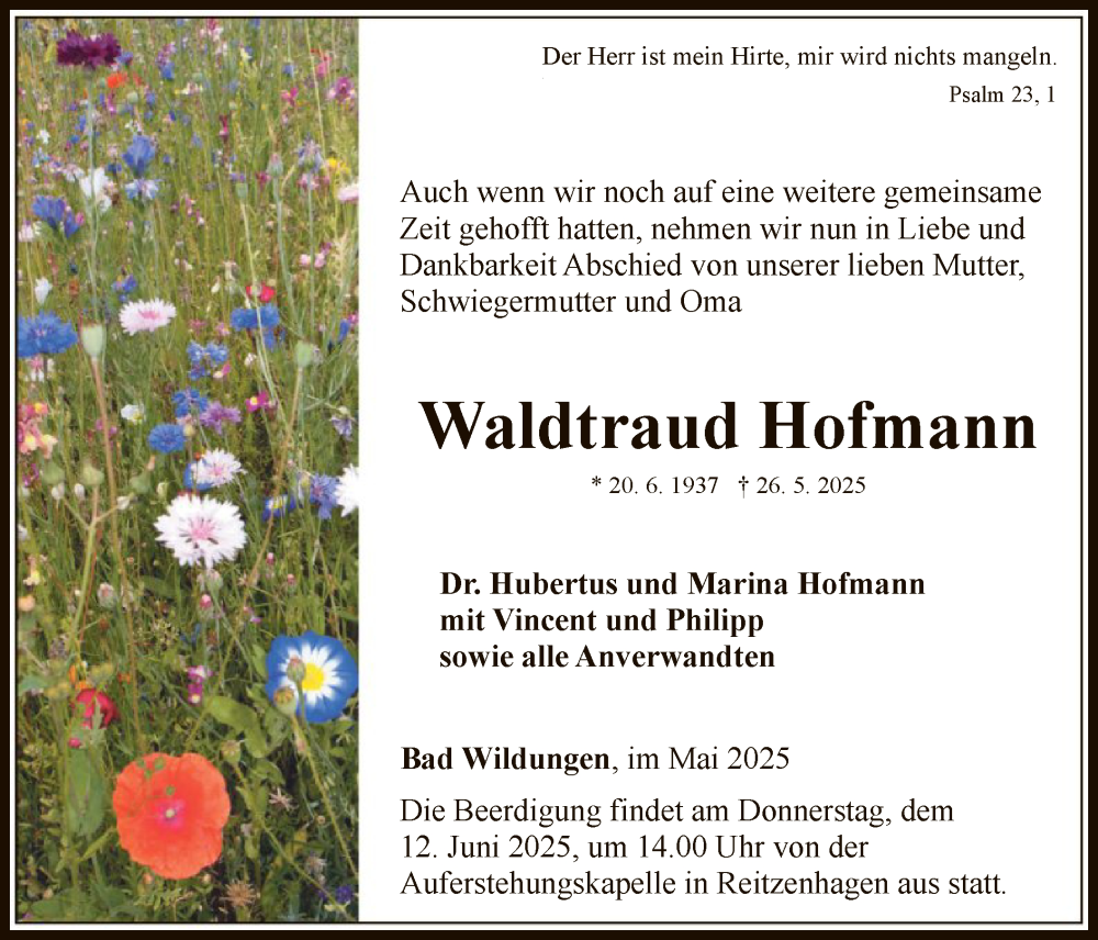 Hier finden Sie alle Traueranzeigen aus der Zeitung, die bisher für Waldtraud Hofmann erschienen sind. Weitere Traueranzeigen, die in der Zeitung erscheinen, werden hier ebenfalls aufgelistet