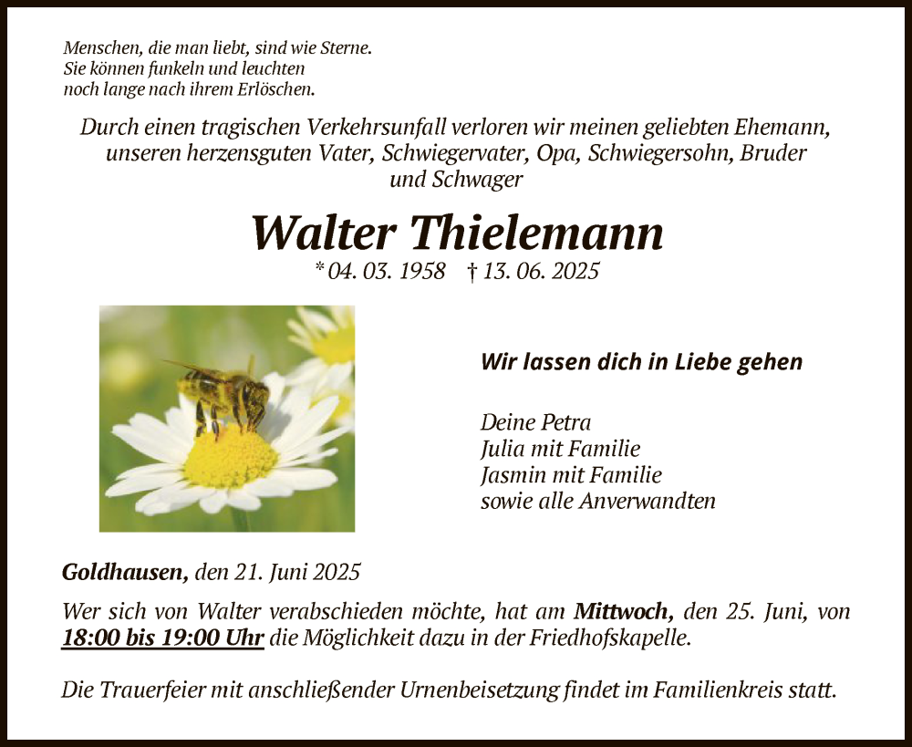 Hier finden Sie alle Traueranzeigen aus der Zeitung, die bisher für Walter Thielemann erschienen sind. Weitere Traueranzeigen, die in der Zeitung erscheinen, werden hier ebenfalls aufgelistet