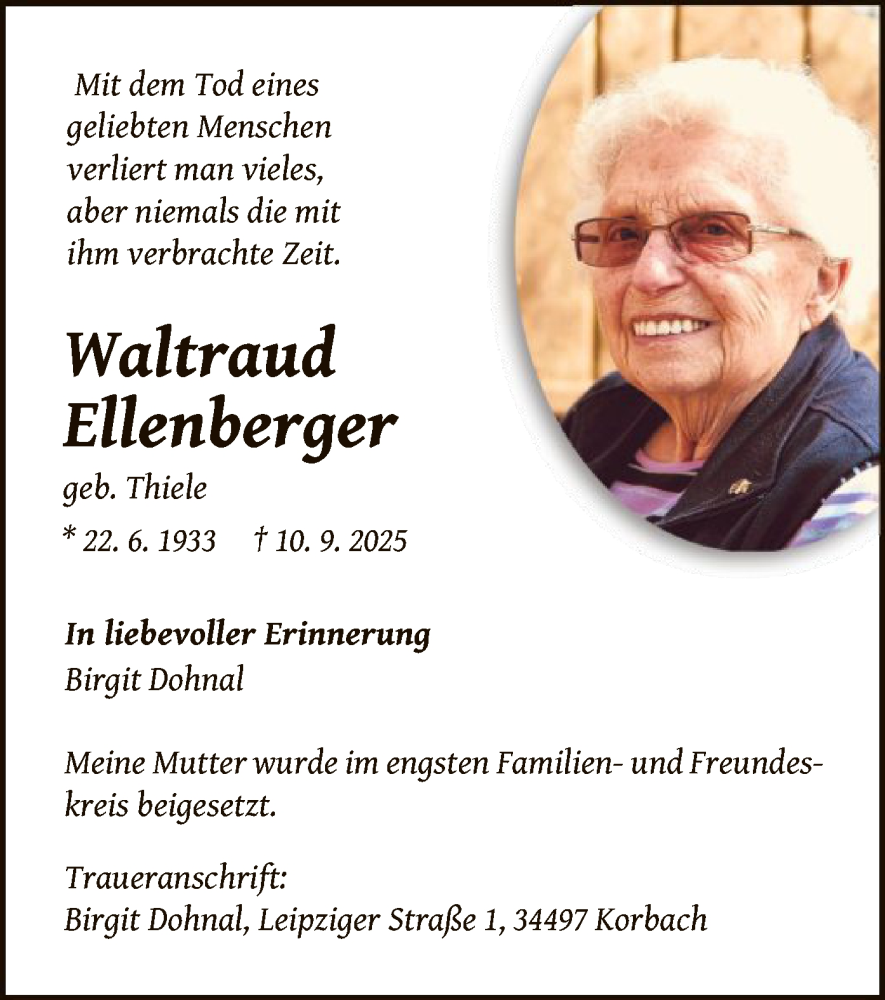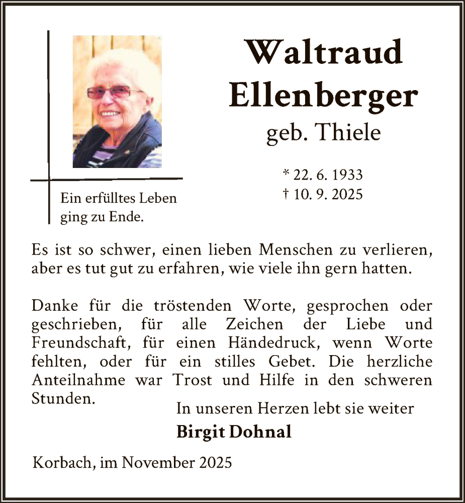 Hier finden Sie alle Traueranzeigen aus der Zeitung, die bisher für Waltraud Ellenberger erschienen sind. Weitere Traueranzeigen, die in der Zeitung erscheinen, werden hier ebenfalls aufgelistet