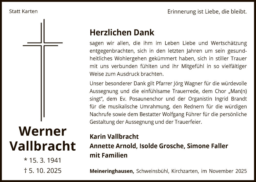 Hier finden Sie alle Traueranzeigen aus der Zeitung, die bisher für Werner Vallbracht erschienen sind. Weitere Traueranzeigen, die in der Zeitung erscheinen, werden hier ebenfalls aufgelistet
