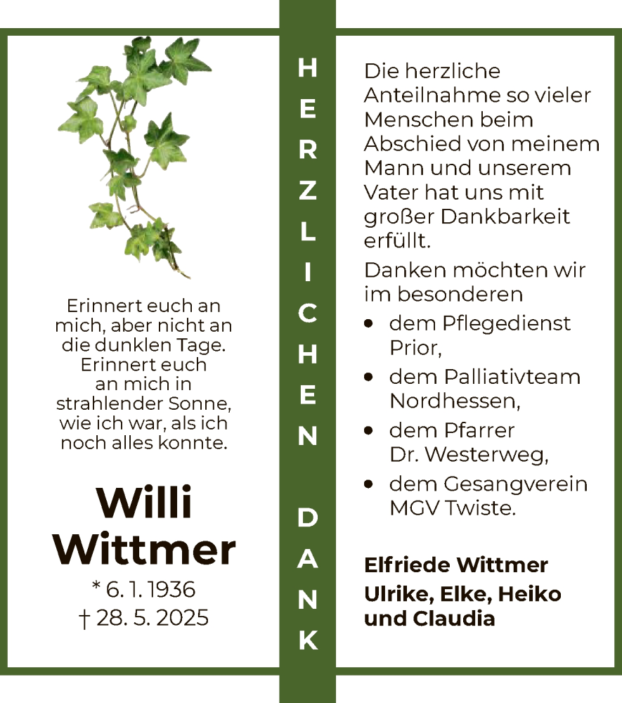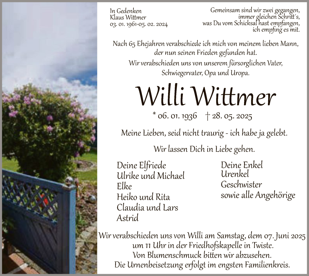 Hier finden Sie alle Traueranzeigen aus der Zeitung, die bisher für Willi Wittmer erschienen sind. Weitere Traueranzeigen, die in der Zeitung erscheinen, werden hier ebenfalls aufgelistet